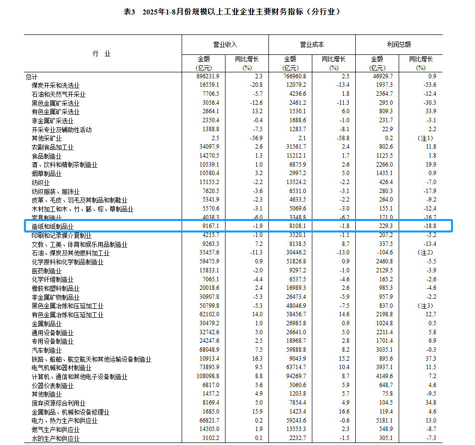 其中,值得注意的是,1-8月造纸和纸制品业营业收入9167.1亿元,同比下降1.9%;营业成本8108.1亿元,同比下降1.8%;利润总额229.3亿元,同比下降18.8%。